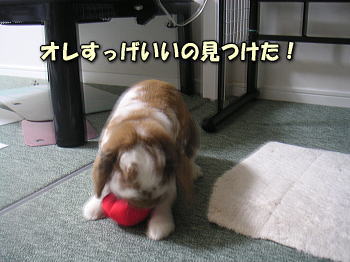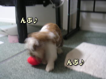 吊るす紐の部分をおクチに咥えて、左右にぶらぶらさせながら、超るんるんで飛び跳ねてるんですよ。