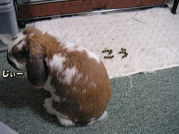 昨日も食べた新鮮ペレットをお皿に出して、さあ、どうぞ御白様 v