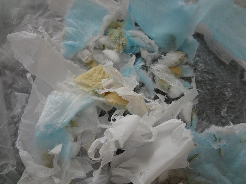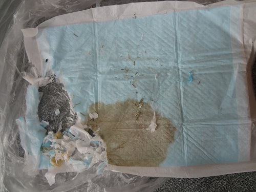 ケージの下に敷いているペットシーツを、金網の隙間から引っ張り出してバラバラにしてたの。
